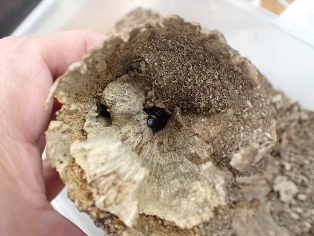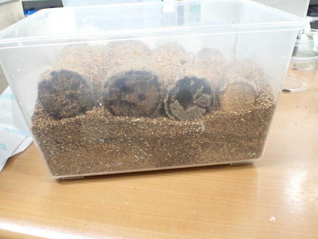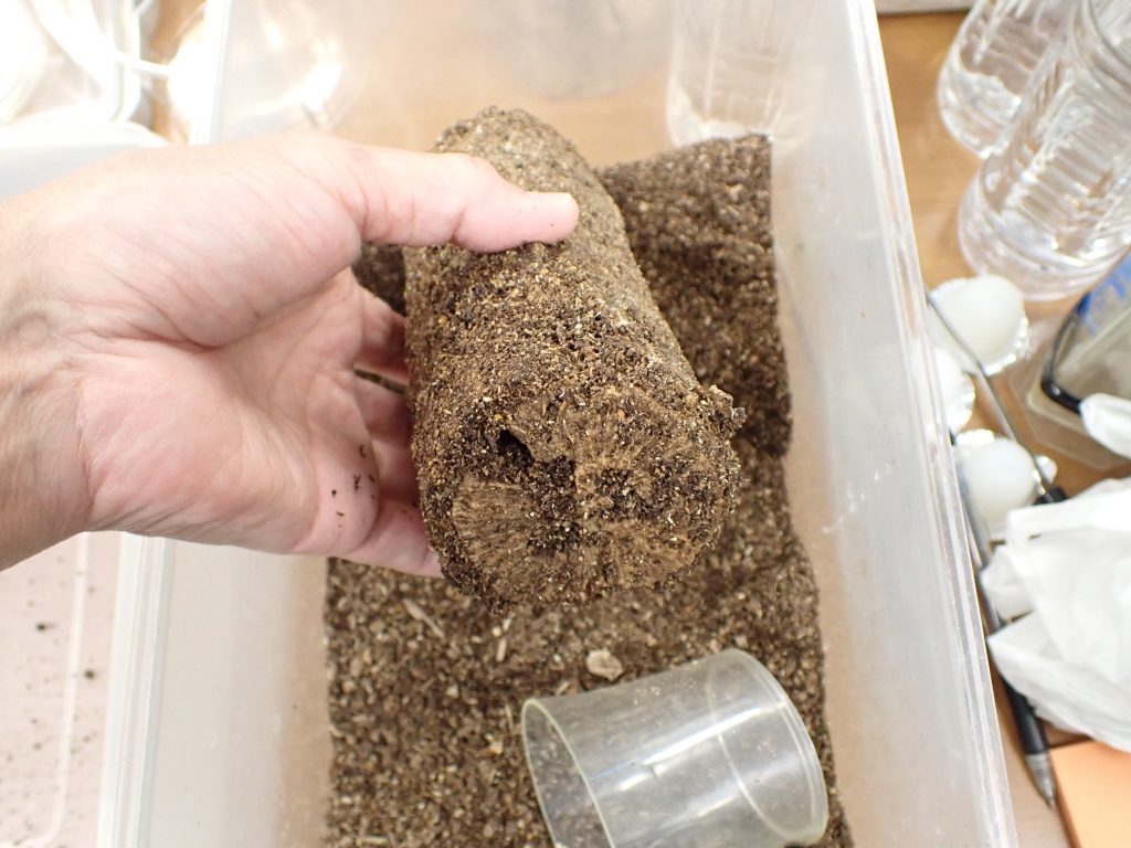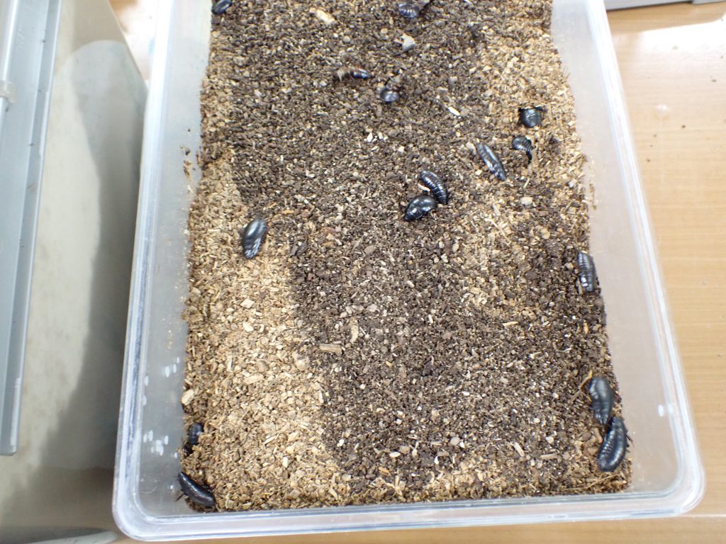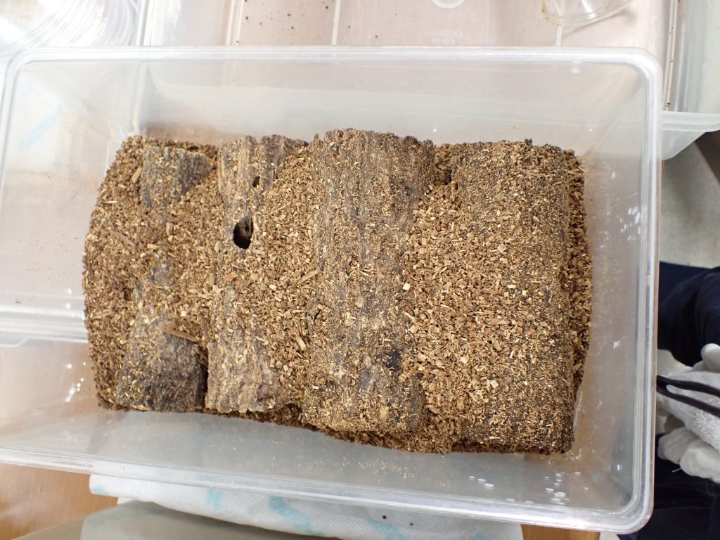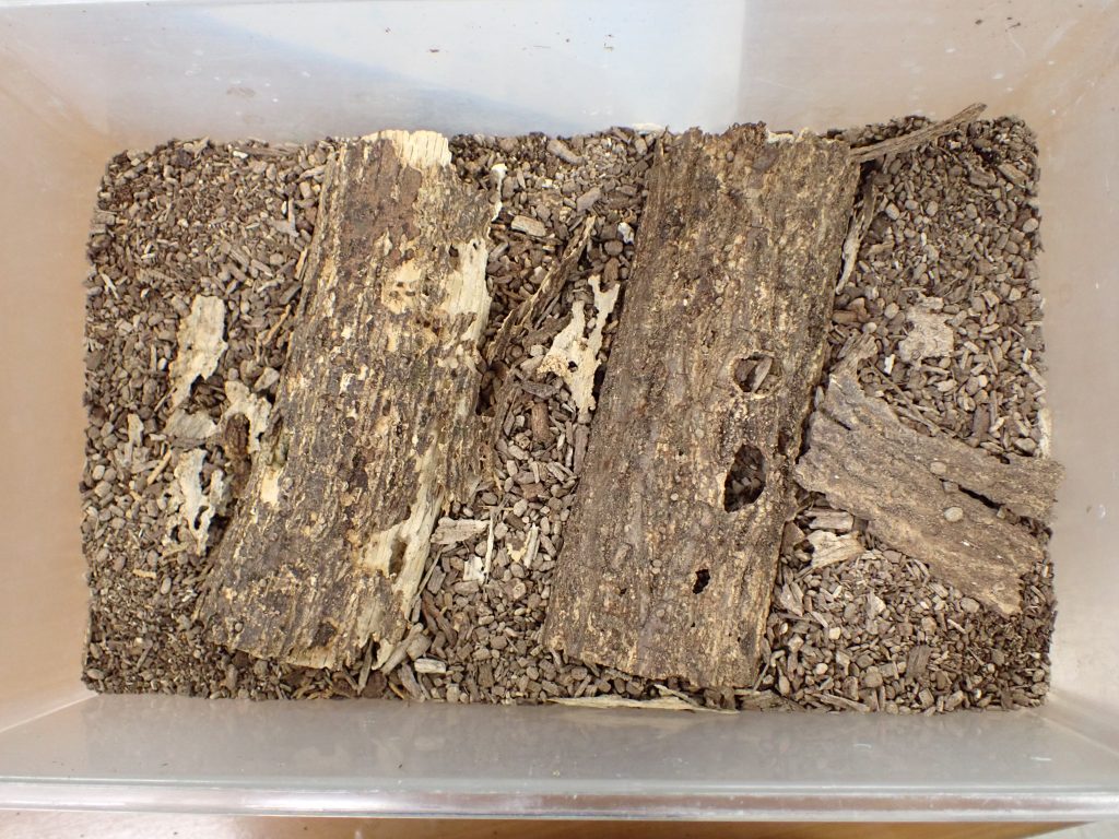 新しいケージの底に新しい加水した朽木を入れ,その合間に古い虫体が潜っている剤を散りばめます.