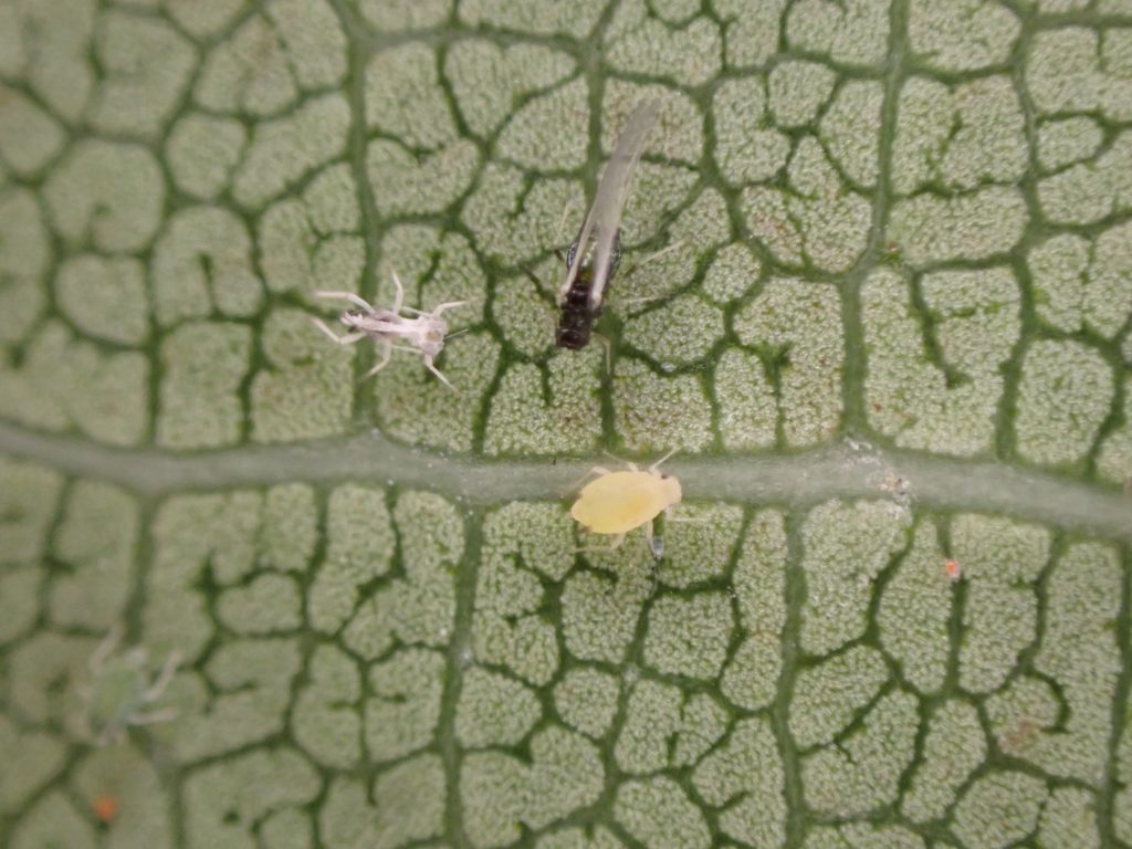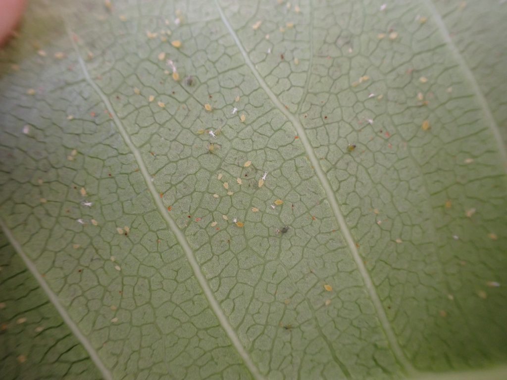 気候が良くなったので,そろそろ外に出そうかと葉を眺めていると葉裏にアブラムシ発見.