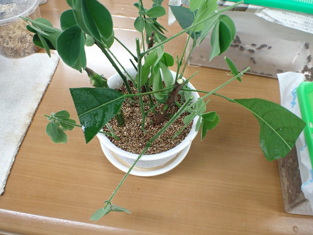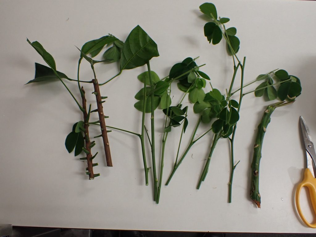 挿したのは以前から乾燥させていたプルメリア,モンキーポッド,カカオの3種.
